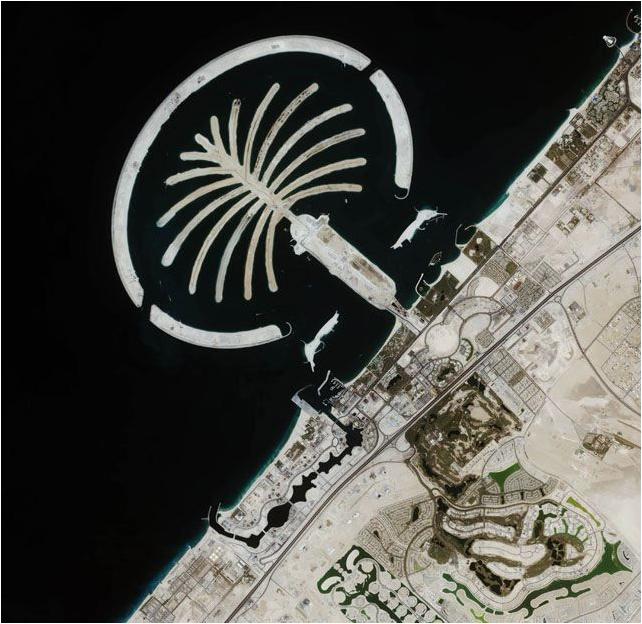 Esta imagem de satélite Ikonos foi coletada em 16 de julho de 2004. A imagem mostra esta ilha artificial que se encontra ao largo da costa de Dubai, no Golfo Pérsico. A ilha está sendo construída a partir de 80 milhões de metros cúbicos de terra dragada do canal de acesso do Emirado de Jebel Ali Port. Este resort terá 1.200 unifamiliares e 600 residências multi-familiares, um parque de diversões aquáticas, shopping centers e cinemas, entre outras coisas.