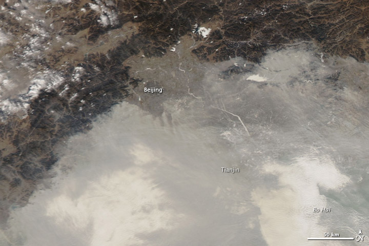 A NASA publicou uma imagem da névoa de poluição cobrindo toda a Planície do Norte da China. O problema é tão grave que dá para ver a poluição a milhares de quilômetros no espaço.