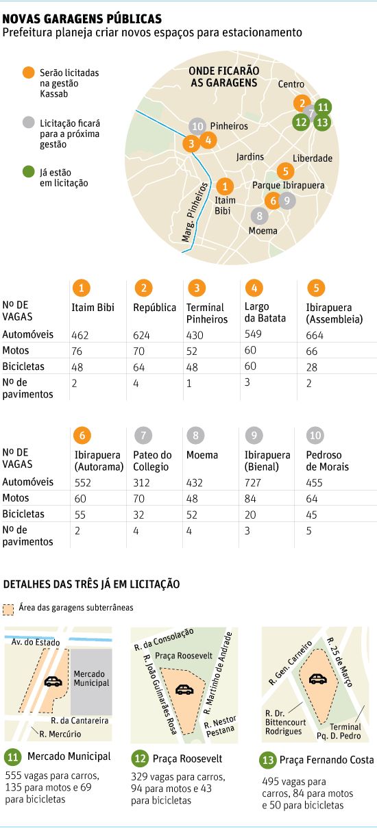 As regiões do Itaim Bibi, República, terminal Pinheiros, largo da Batata, Assembleia Legislativa e Ibirapuera (autorama) devem ganhar garagens subterrâneas privadas com incentivo fiscal e concessão de área pública.