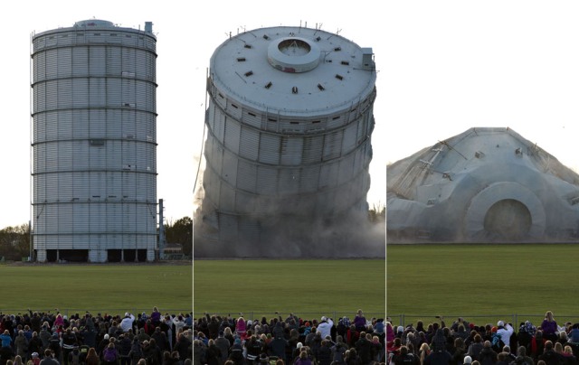 Multidão acompanha a demolição da segunda construção mais alta da Dinamarca, um depósito de gás de 108 metros de altura em Copenhague. A construção que estava sem uso desde 2007 veio abaixo em 8 segundos.