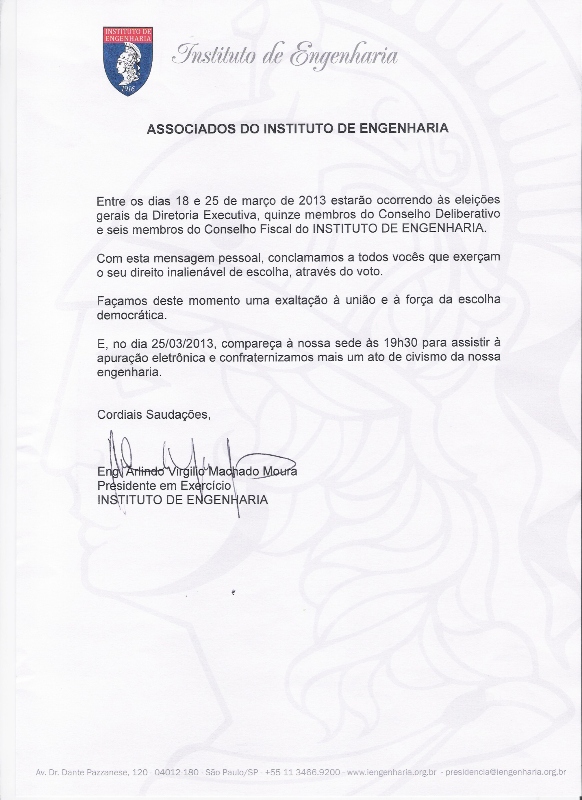 Instituto de Engenharia - Av. Dr. Dante Pazzanese, 120 – V. Mariana - São Paulo / SP