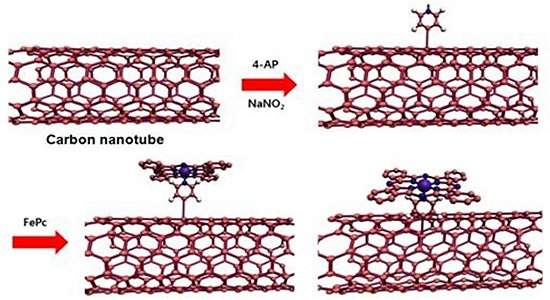 Além de dar suporte às moléculas FePc e fornecer o eixo para o centro de ferro, os nanotubos de carbono funcionam como uma via rápida para a transferência de elétrons para os pontos ativos da reação de redução do oxigênio.