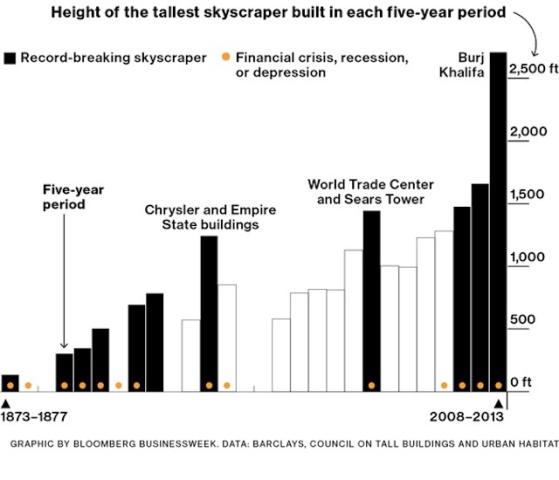 E, como Lawrence provou, o índice se mantém há anos. No início de 1900, o Pânico de 1907 coincidiu com a construção de duas torres altíssimas. O padrão continuou, com o Empire State Building sendo inaugurado pouco antes do crash de 1929, que gerou a Grande Depressão. O World Trade Center original ficou pronto pouco antes do Crash do Mercado de Ações de 1974, e ainda temos o Burj Khalifa e dezenas de outros prédios altíssimos. Meta-análise de 2011 colocou em questão a ideia de existir uma correlação real entre os fatos, mas confirmou que a altura dos prédios e o crescimento econômico estão relacionados.