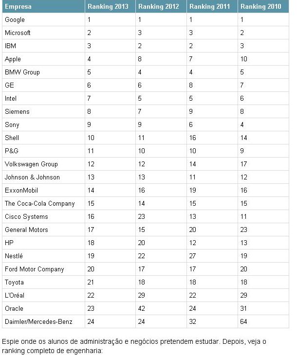 Além do Google, Microsoft e IBM completam o pódio. A Apple, oitava no ranking do ano anterior, desta vez, subiu para a quarta posição. Depois, vem o grupo BMW e General Electric (GE).