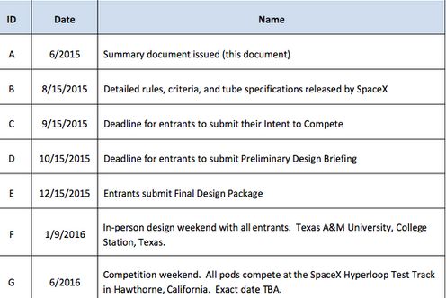 Equipes interessadas em participar da competição devem se cadastrar no site oficial até 15 de setembro e os designs finais devem ser enviados até 15 de dezembro. Os pods finalistas competirão na pista de testes do Hyperloop, que será construída próxima à base da SpaceX, em Hawthorne, Califórnia, em junho de 2016.