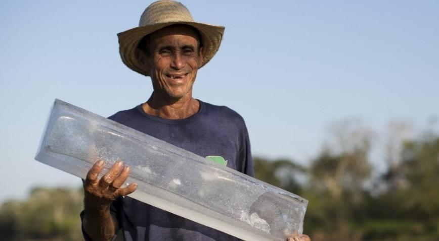 Francisco da Silva Vale, 61, posa com bloco de gelo produzido com a energia gerada por painéis solares instalados em Vila Nova do Amana, em uma reserva sustentável no Estado do Amazonas. Os painéis foram instalados dentro do projeto Gelo solar, do Instituto de Desenvolvimento Sustentável Mamiraua em conjunto com pesquisadores da USP (Universidade de São Paulo). Com a maior geração de energia, a comunidade passou a produzir 90 quilos de gelo diariamente para a conservação de alimentos, bombear água para as casas e garantir a iluminação para o campo de futebol