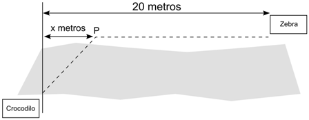 Um crocodilo está caçando uma zebra localizada a 20 metros de distância na margem oposta do rio. Crocodilos viajam a velocidades diferentes em terra e na água.