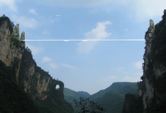 Foi recentemente anunciada como sendo a Ponte de Vidro Mais Longa do Mundo e será construída sobre um desfiladeiro do Parque Natural de Zhangjiajie, na província de Hunan. O tabuleiro, com uma largura de 6 metros e totalmente transparente, ficará localizado uns vertiginosos 300 metros acima do nível do solo. A estrutura, atirantada, foi dimensionada para uso exclusivamente pedonal, tendo sido projetada pelo gabinete israelita Haim Dotan.