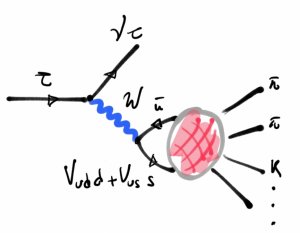 Esquema do decaimento do lépton tau, que decai em um neutrino e em um bóson W (em azul). Os quarks são produzidos pelo W e interagem fortemente (bolha rosa), formando os hádrons que são detectados (pions e káons). O processo possibilita determinar um valor para a constante de acoplamento forte.[Imagem: Diogo Boito]