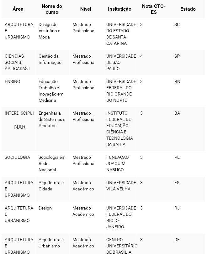Na tabela publicada no Diário Oficial é possível também ver a nota recebida pelos cursos na coluna nota CTC-ES. Trata-se da avaliação do Conselho Técnico Científico da Educação Superior, da Fundação Capes, que varia de 1 a 5 para programas com apenas mestrado e de 1 a 7 para programas que têm doutorado