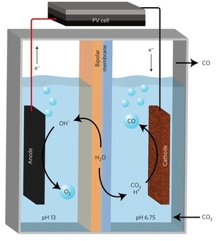 O sistema ainda usa o mesmo catalisador como catodo para reduz o CO2 em CO e como anodo para oxidar a água para oxigênio através do que é conhecido como a “reação de evolução do oxigênio”, com os gases sendo separados por uma membrana bipolar.