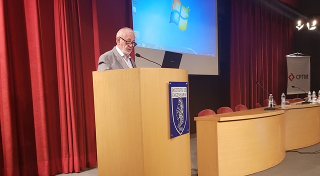 À dir., Eduardo Lafraia, presidente do Instituto de Engenharia, e Paulo de Magalhães Bento Gonçalves, presidente da CPTM, durante abertura da apresentação