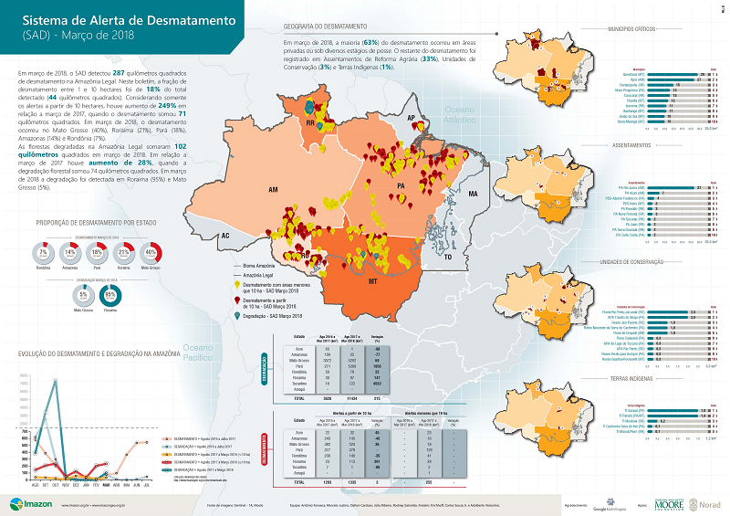 Último relatório divulgado pelo Instituto Homem e Meio Ambiente da Amazônia (Imazon) aponta que o desmatamento na Amazônia Legal, área que compreende nove estados brasileiros e corresponde a quase 60% do território brasileiro, atingiu 287 km2 em março de 2018. Para efeito de comparação, neste mesmo mês, em 2015, o desmatamento era de 58 km2, ou seja, ele era cinco vezes menor.