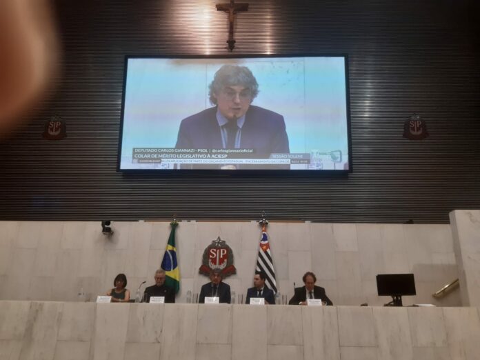 O presidente do Instituto de Engenharia, José Eduardo Jardim, prestigiou a solenidade em comemoração aos 50 anos da Academia de Ciências do Estado de São Paulo (ACIESP), nesta segunda (2), na Assembleia Legislativa do Estado de São Paulo.
