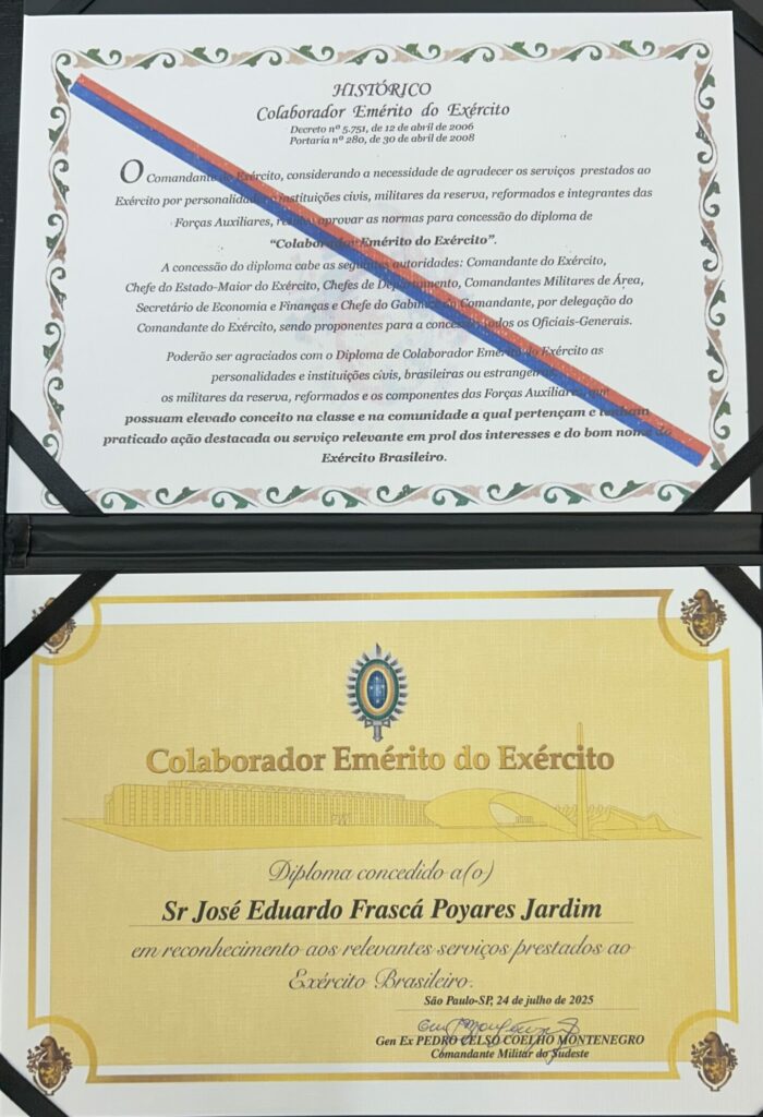 Na ocasião, o Ten R/2 Jardim recebeu o diploma de reconhecimento pelos seus serviços prestados para o Exército Brasileiro como combatente de artilharia.