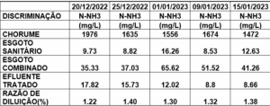 Estes elevados índices de Nitrogênio amoniacal do chorume, acabam por desestabilizar os processos de tratamento tanto aeróbio, como anaeróbio reduzindo a eficiência dos processos biológicos de tratamento. Além disso, o efluente tratado terá um teor de Nitrogênio amoniacal até maior que o do esgoto bruto combinado, mesmo considerando a diluição proposta de no máximo 1%.(Ver tabela). Ou seja, quando combinado com o chorume, o sistema de tratamento de esgotos, dispensado pela regra atual de enquadrar o Nitrogênio amoniacal, acaba por elevar a concentração deste composto no efluente tratado.