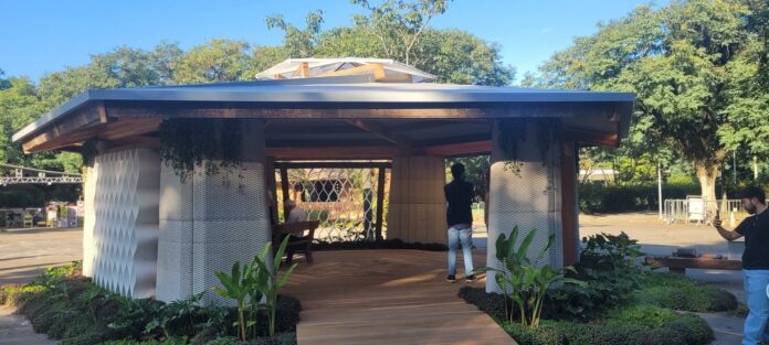 O telhado utiliza uma estrutura recíproca, em que uma viga apoia na outra, distribuindo as cargas de forma eficiente. Isso permite vencer grandes vãos com menos material. Antes de ser adaptado para a Bienal, conseguimos um vão de quase 20 metros.
