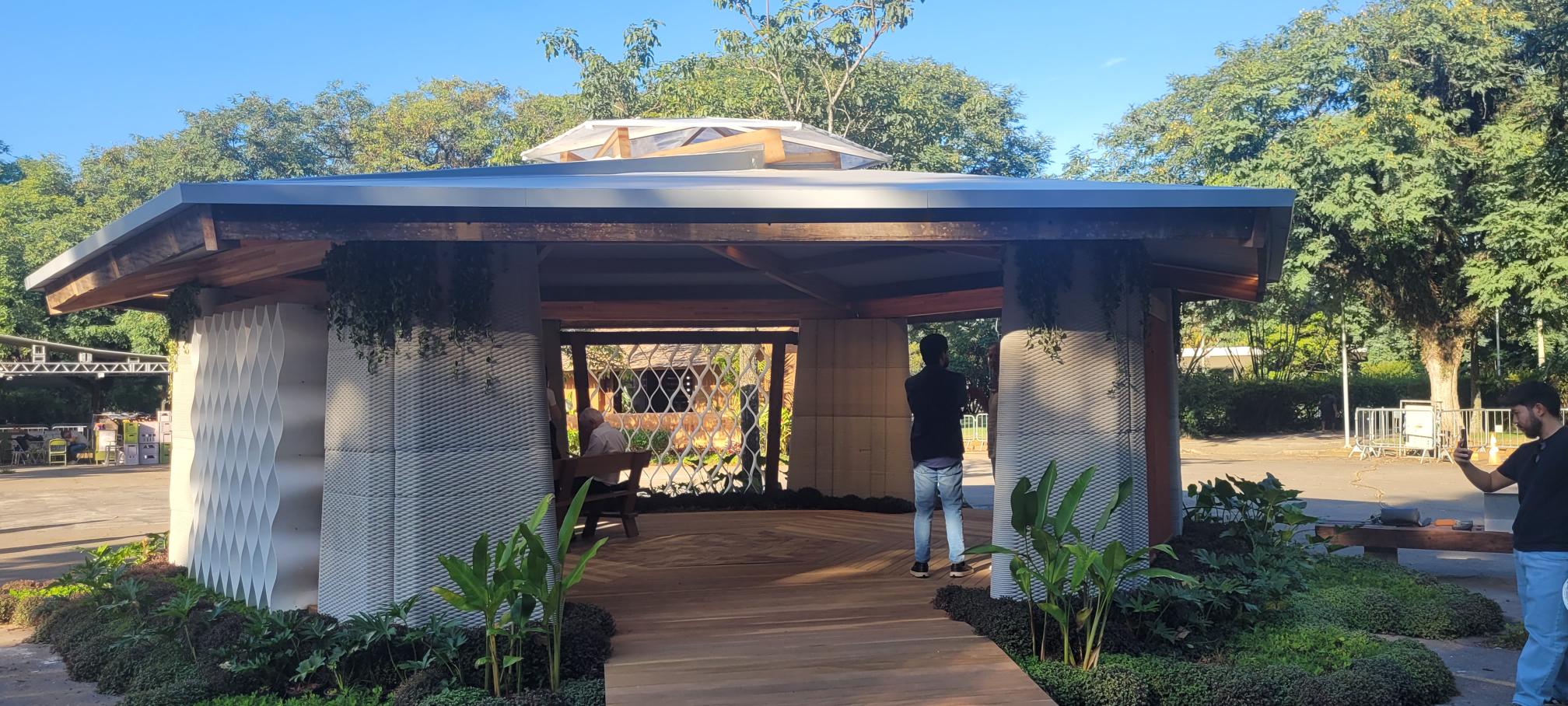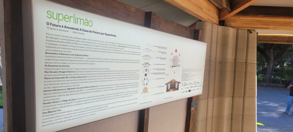 Fomos convidados para criar uma casa dentro da Bienal, com um detalhe importante: somos a única casa sem patrocínio. Isso nos deu liberdade total para focar exclusivamente na arquitetura. Em uma bienal de arquitetura brasileira, a pergunta central foi: como trazer tecnologia e inovação pensando na construção do futuro, considerando a realidade do Brasil?