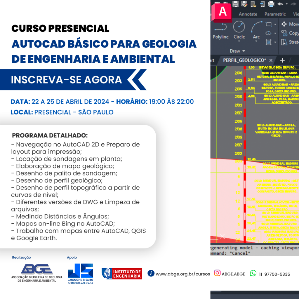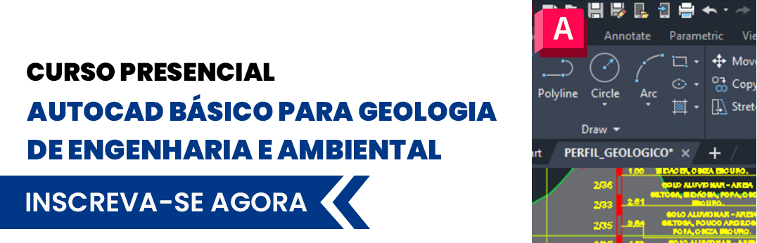 Estão abertas as inscrições para o curso “AutoCAD Básico para Geologia de Engenharia e Ambiental”, com o objetivo de capacitar profissionais nas áreas de Geologia de Engenharia e Geotecnia. O curso abordará temas como trabalho com mapas em AutoCAD, QGIS e Google Earth, elaboração de mapa geológico, navegação no AutoCAD 2D e preparo de layout para impressão, locação de sondagens em planta, entre outros.