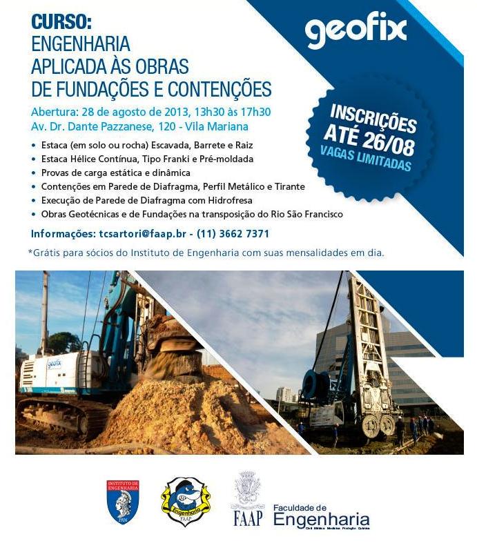 COOPERAÇÃO TECNOLÓGICA – FEFAAP / GEOFIX CURSO GRATUITO PARA ASSOCIADOS AO INSTITUTO DE ENGENHARIA EM DIA COM AS MENSALIDADES E ESTUDANTES DE ENGENHARIA. Local: – Abertura e Encerramento,